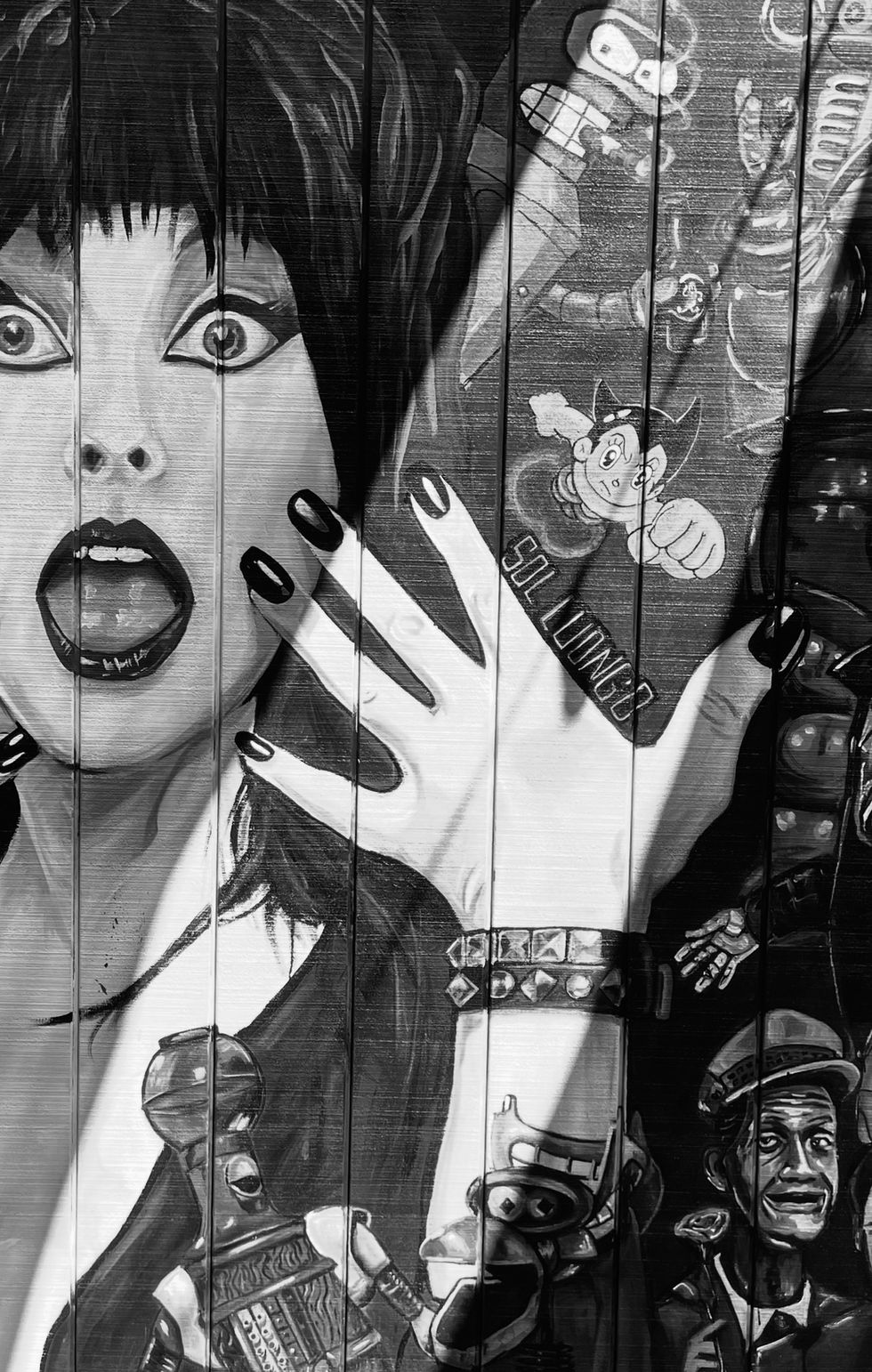 We’re living in strange times where artificial intelligence is increasingly taking over tasks once done by humans. Drawing from that theme, I wanted to explore the dynamic between humans and machines. Elvira (Cassandra Peterson), who also hosted "Elvira’s Movie Macabre", felt like the perfect figure to represent humanity in this “Humans vs. Robots” mural and to be the hostess of this wall.